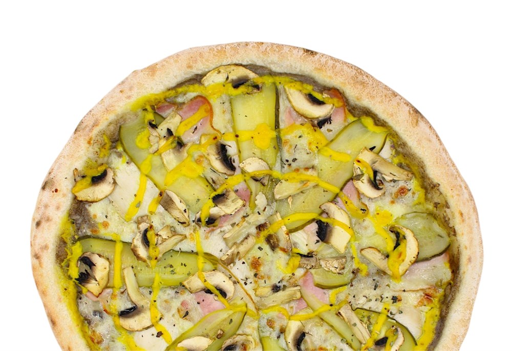 Филе курицы, бекон, грибы шампиньоны, маринованный огурчик, сыр моцарелла, соус "Сливочно-грибной", сладкий горчичный соус